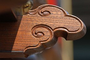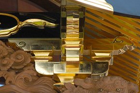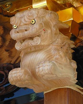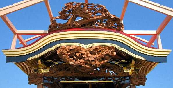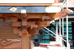 足場を撤去する前に乗らせていただき正面の破風・彫刻を撮影、厚みのある見事な彫刻で、写真より実物を見るのをお勧めします