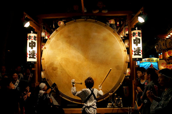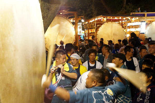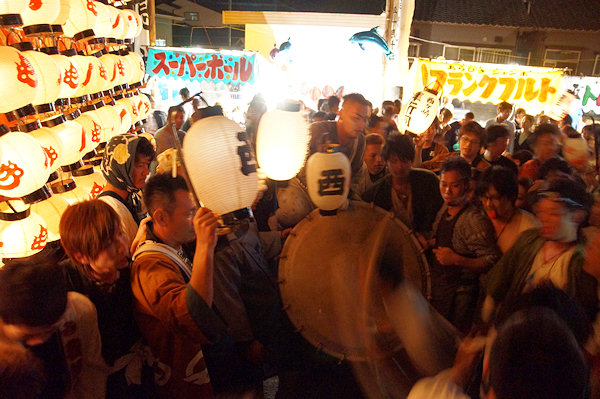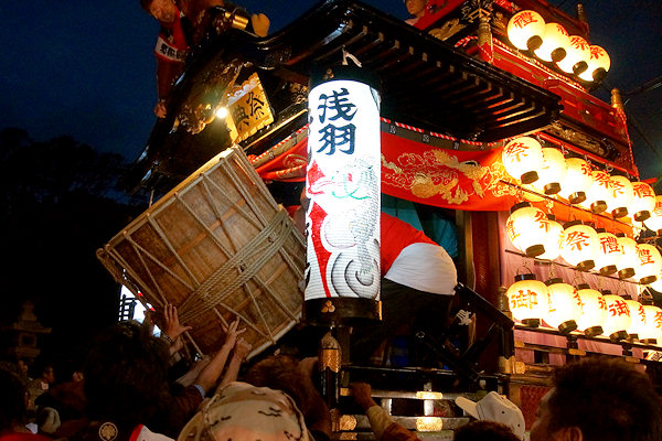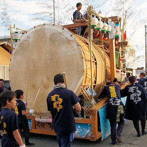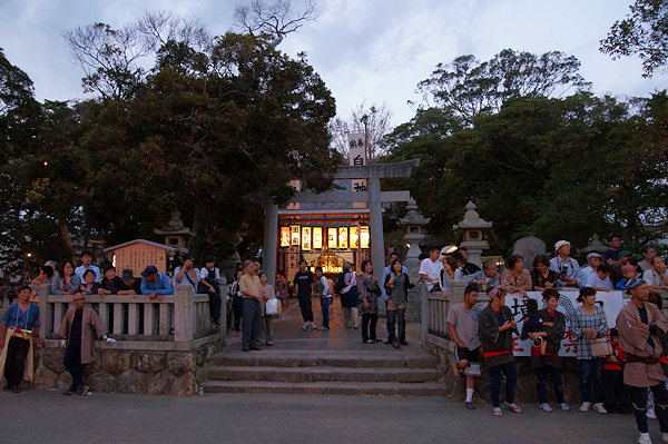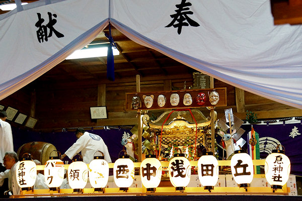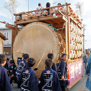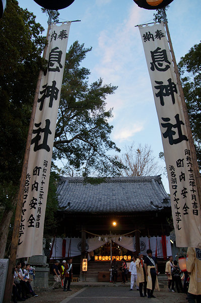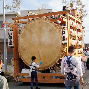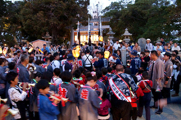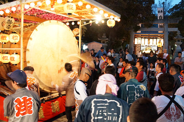 宇布見の氏神・息神社です 昭和32年、大太鼓で有名な舞阪を手本に西ヶ崎で始まった大太鼓が三十数年を経て各字に広まり見事な祭り行事に発展してきたそうです。その大太鼓を載せる太鼓台は運搬台の役目に加えて欄干が設けられたり提灯や幕が飾られ各字個性があります。神社前の見せ場では競ってたたきます。館車からも太鼓を下してたたき、終わるとまた載せて定位置に向かいます。